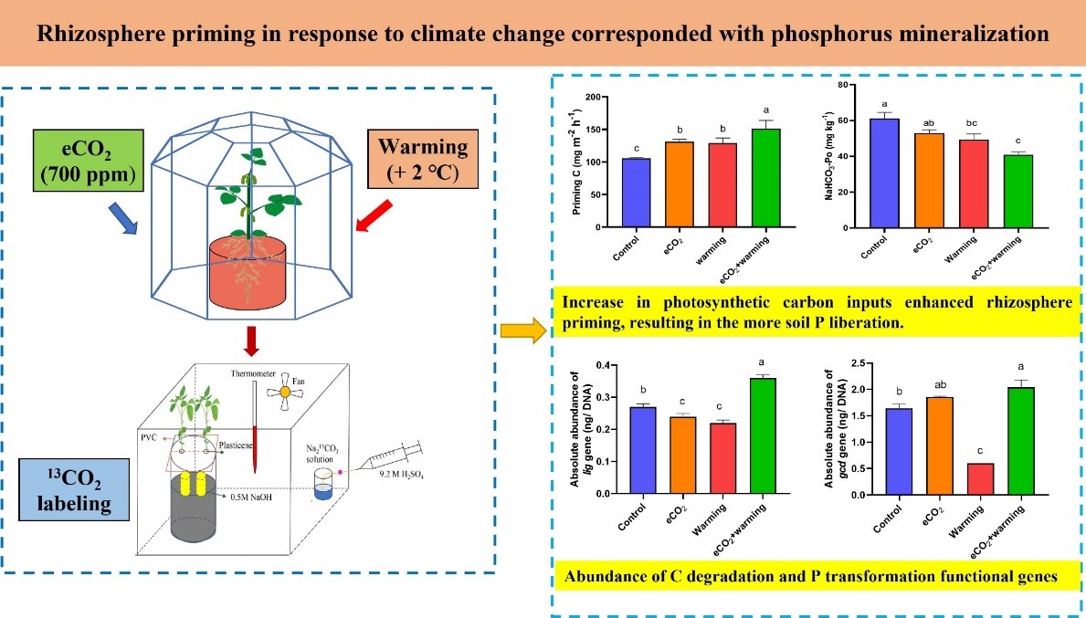 中國科學(xué)院東北地理所農(nóng)田分子生態(tài)學(xué)科組研究人員,利用開頂式氣候室(OTC)模擬大氣CO2濃度和溫度升高,利用13C示蹤技術(shù)來區(qū)別土壤呼吸來源植物碳和土壤碳,解析大豆生育期間的土壤呼吸、磷轉(zhuǎn)化以及相關(guān)功能基因豐度,旨在探究氣候變化引發(fā)的根際激發(fā)效應(yīng)與土壤磷素轉(zhuǎn)化的關(guān)聯(lián),最終明確土壤微生物功能在碳磷協(xié)同轉(zhuǎn)化中的作用。