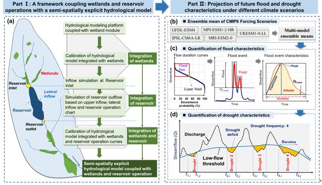 (a)流域濕地-水庫聯(lián)合調蓄的分布式耦合框架;(b)基于CMIP6的多情景數據的集合平均;(c)基于閾值法洪水事件的確定和特征的提取;(d)基于游程理論的干旱事件的確定及特征的提取。