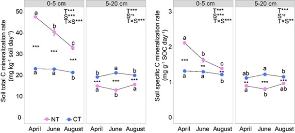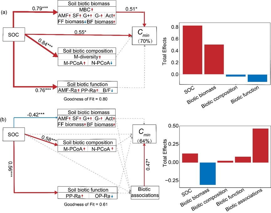 中國科學(xué)院東北地理與農(nóng)業(yè)生態(tài)研究所黑土有機(jī)碳與保護(hù)性耕作學(xué)科組科研人員依托吉林省德惠市始建于2001年的保護(hù)性耕作長期定位實(shí)驗(yàn)開展了相關(guān)研究。意在闡明土壤潛在碳礦化對長期保護(hù)性耕作的響應(yīng)模式,并探究不同土壤深度下潛在的生物機(jī)制。結(jié)果表明,與常規(guī)耕作相比,秸稈覆蓋還田保護(hù)性耕作顯著提高了表層土壤(0-5 cm)的潛在碳礦化速率,而降低了底土(5-20 cm)的碳礦化速率(圖1)。結(jié)構(gòu)方程模型表明,增加的土壤有機(jī)碳可以直接或通過提高表層土壤生物的生物量來促進(jìn)土壤碳礦化,而在底土中,土壤潛在碳礦化速率的增加主要是通過生物關(guān)聯(lián)的加強(qiáng)來實(shí)現(xiàn)的(圖2和圖3)。這些發(fā)現(xiàn)為土壤生物群落在碳礦化中的作用提供了新的見解,并強(qiáng)調(diào)了不同土壤深度下土壤碳礦化對耕作方式的響應(yīng)機(jī)制不同。