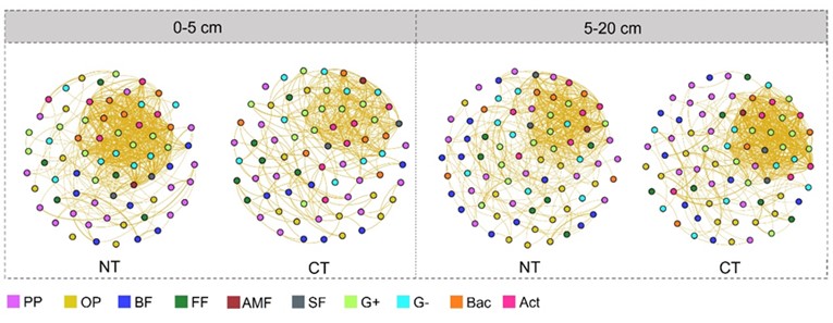 圖2不同耕作方式下表層土壤和底土生物關(guān)聯(lián)的網(wǎng)絡(luò)圖。