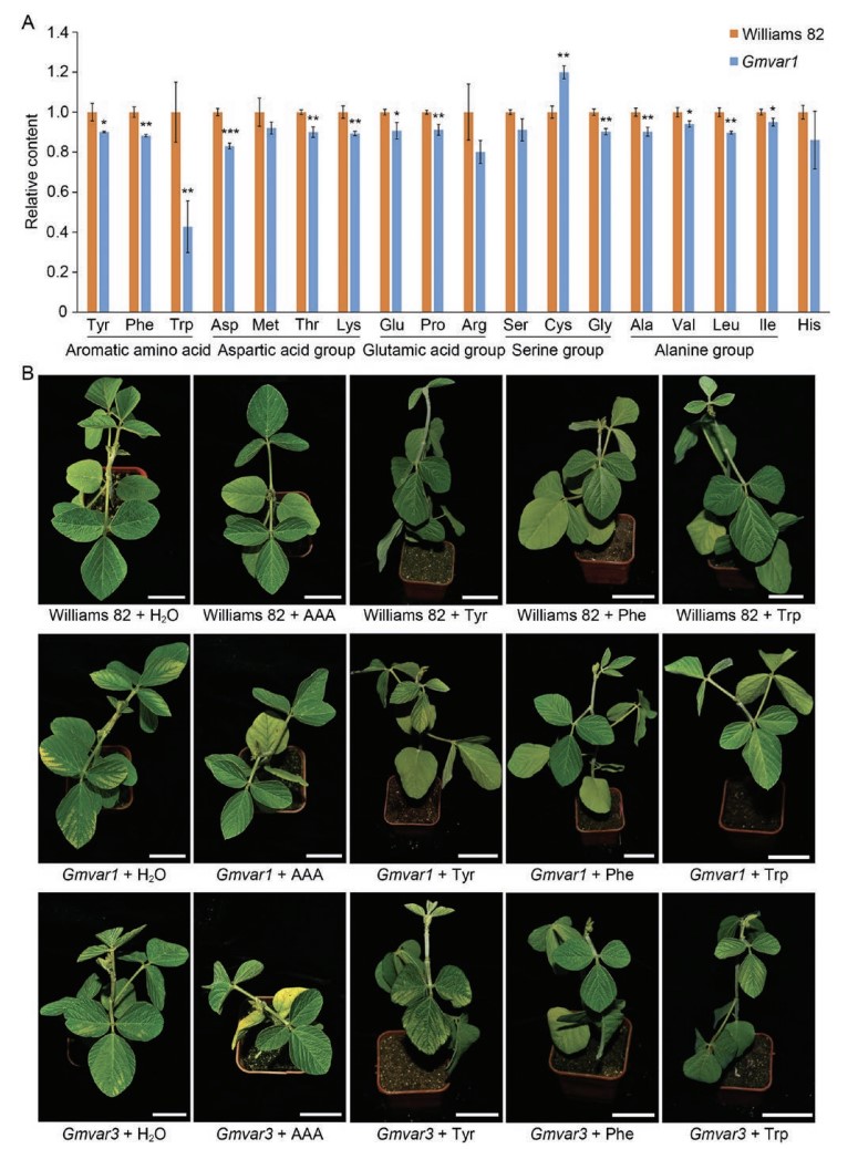 近日,中國科學(xué)院東北地理與農(nóng)業(yè)生態(tài)研究所大豆功能基因組學(xué)學(xué)科組從人工誘變大豆群體中鑒定了四個葉片黃綠雜色突變體,Gmvar1、Gmvar2、Gmvar3和Gmvar4(圖1)。基于圖位克隆、等位基因鑒定實(shí)驗和CRISPR基因敲除突變體,證明突變的GmCS1控制Gmvar突變體的葉片黃綠雜色表型(圖2)。GmCS1編碼大豆的分支酸合酶,Gmcs1突變體中苯丙氨酸、酪氨酸和色氨酸的含量顯著降低(圖3)。對Gmvar突變體外源施加三種芳香族氨基酸混合物以及僅施加苯丙氨酸,可以使突變體葉片黃綠雜色表型的恢復(fù)(圖3)。在Gmvar突變體中,與代謝和生物合成相關(guān)的各種生物過程和信號通路被改變。