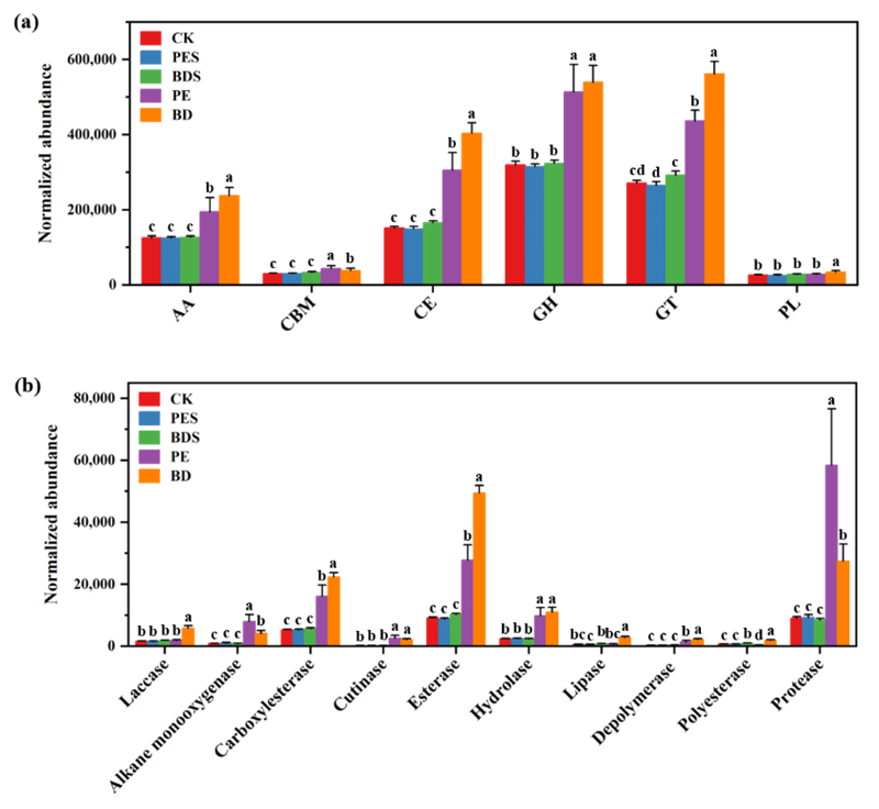圖1 微塑料殘留下土壤及微塑料圈的水解酶(a)和降解酶(b)豐度