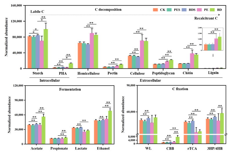 為此,東北地理所農(nóng)田分子生態(tài)學科組研究人員在前期研究的基礎(chǔ)上(J. Hazard. Mater., 2022. 2023),繼續(xù)探究傳統(tǒng)(聚乙烯,PE-MP)和生物可降解(聚乳酸-己二酸對苯二甲酸丁二醇酯,BMP)微塑料殘留對黑土及微塑料圈的碳循環(huán)相關(guān)功能微生物及微塑料的酶解特征。