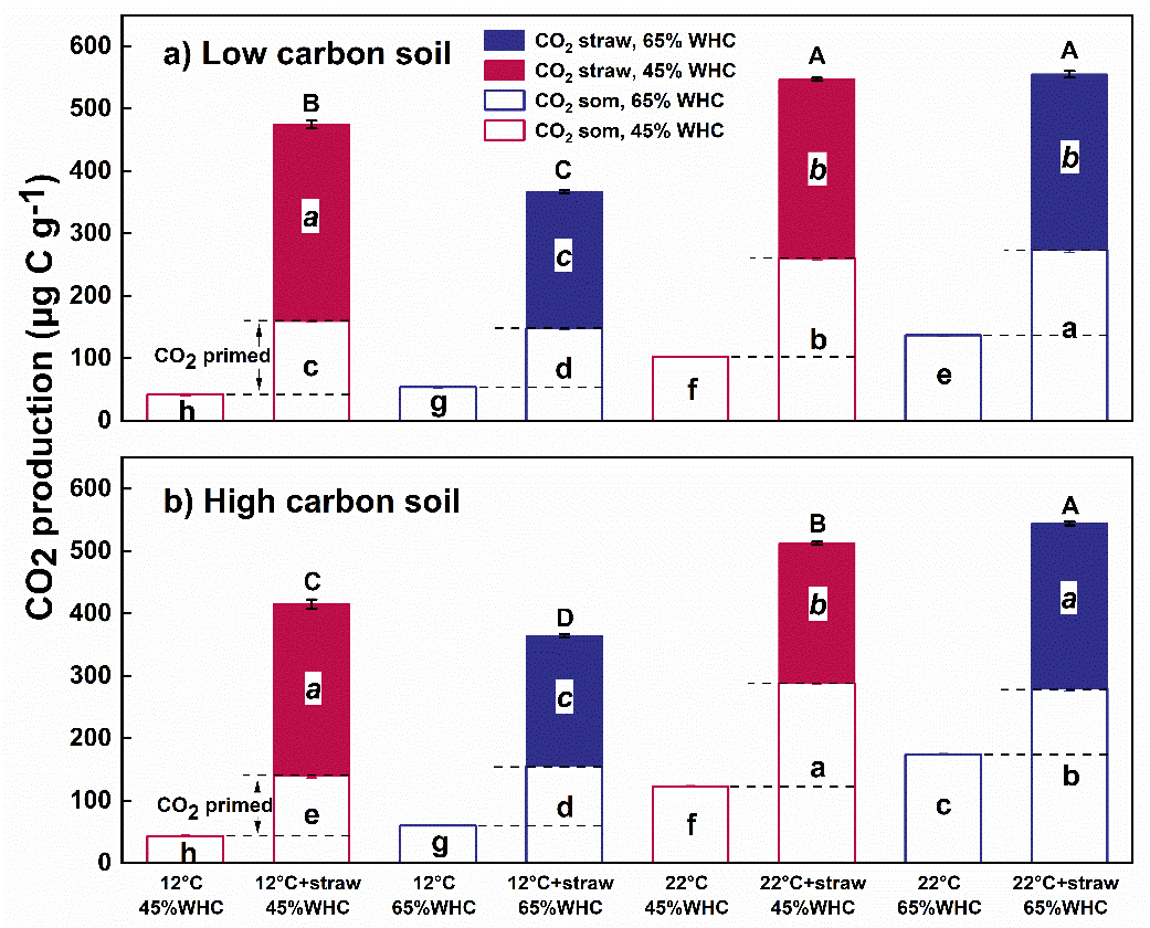 為此,東北地理所土壤物質(zhì)循環(huán)學(xué)科組李祿軍團隊研究人員以東北農(nóng)田黑土為研究對象,通過微宇宙控制實驗,利用13C穩(wěn)定同位素示蹤技術(shù),深入探究土壤溫度(12°C和22°C)和濕度(45%WHC和65%WHC)及其耦合作用對土壤有機質(zhì)激發(fā)效應(yīng)及其溫度敏感性的影響。