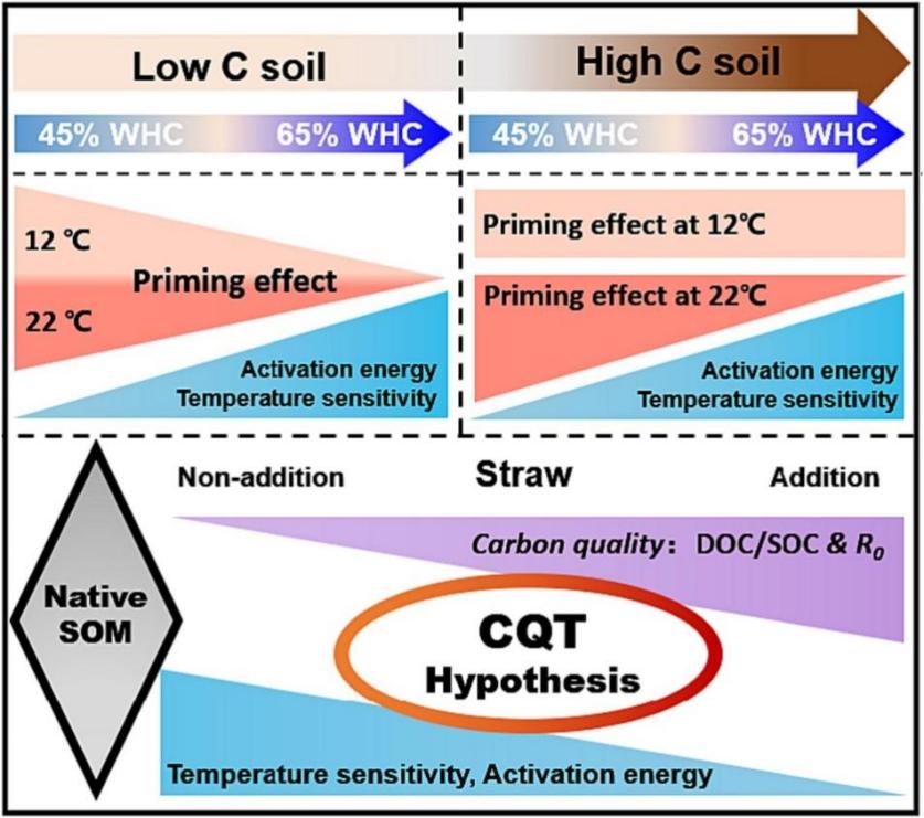 土壤有機質(zhì)(SOM)在農(nóng)田土壤肥力維持、碳封存和緩解氣候變化起著至關(guān)重要的作用,將作物殘留物還田被認(rèn)為是維持和提升SOM的重要措施之一,然而,殘留物還田可能加速SOM的礦化,即為激發(fā)效應(yīng)(PE),溫度敏感性(Q10)作為表征SOM礦化特性的重要參數(shù),很大程度上決定著陸地生態(tài)系統(tǒng)碳循環(huán)與氣候變暖之間反饋關(guān)系的方向與強度。影響SOM礦化過程的因素既包括生物因素,如土壤微生物和植物等,也包括非生物因素,如土壤水分和溫度等。盡管大量研究對SOM礦化過程及其驅(qū)動機制開展了深入探討,但是在外源有機物輸入條件下,多因素耦合影響下如何影響SOM礦化過程尚不明確。
