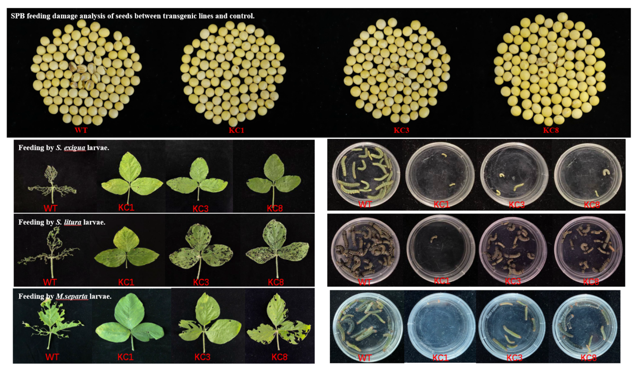 近日,東北地理所農(nóng)田有害生物控制學(xué)科組孟凡立研究員團(tuán)隊在高油大豆品種墾農(nóng)18中表達(dá)cry1C*基因,顯著提高了受體對大豆食心蟲等鱗翅目害蟲的抗性。在田間網(wǎng)室接蟲條件下,表達(dá)cry1C*轉(zhuǎn)基因大豆蟲食率降至5%以下(圖1)。與取食受體葉片的幼蟲相比,取食轉(zhuǎn)基因葉片的甜菜夜蛾(S. exigua)、斜紋夜蛾(S. litura)和黏蟲(M. separata)幼蟲生長受到顯著抑制,體重明顯降低,存活率顯著降低。利用southern blot 和全基因組重測序技術(shù)進(jìn)一步確定了轉(zhuǎn)基因株系KC1的T-DNA拷貝數(shù)和插入位點。轉(zhuǎn)基因株系KC1已在黑龍江省完成轉(zhuǎn)基因生物安全評價環(huán)境釋放試驗,為大豆轉(zhuǎn)基因抗蟲產(chǎn)業(yè)化奠定基礎(chǔ)。
