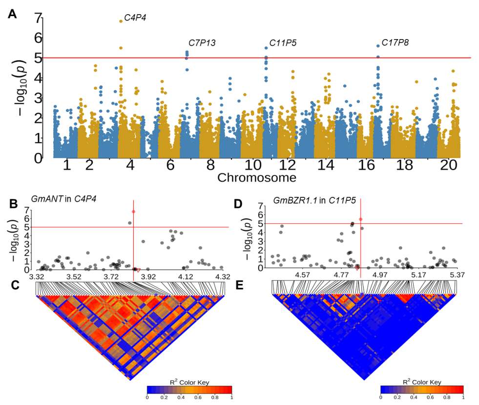 近日,東北地理所大豆遺傳與分子改良學(xué)科組張恒友研究員團(tuán)隊(duì)利用收集的世界大豆全基因組基因分型數(shù)據(jù)和粒重、成熟期數(shù)據(jù),通過(guò)對(duì)多環(huán)境獲得的表型數(shù)據(jù)的全基因組關(guān)聯(lián)分析研究,鑒定了一批參與大豆粒重和生育期的數(shù)量性狀位點(diǎn)(QTL);同時(shí),利用大豆與擬南芥部分生長(zhǎng)發(fā)育的分子機(jī)制相對(duì)保守的特性,結(jié)合擬南芥已報(bào)道粒重和成熟期相關(guān)基因,鑒定了一批大豆粒重和成熟期長(zhǎng)短控制相關(guān)候選基因,為這兩個(gè)性狀的分子生物學(xué)研究和大豆生物育種提供了重要基因資源(圖1)。團(tuán)隊(duì)正在通過(guò)建立的大豆高效遺傳轉(zhuǎn)化平臺(tái)研究這些基因在調(diào)控大豆粒重、蛋白質(zhì)和油脂以及成熟期方面的分子機(jī)制;同時(shí)評(píng)價(jià)它們?cè)谏镉N方面的應(yīng)用潛力。