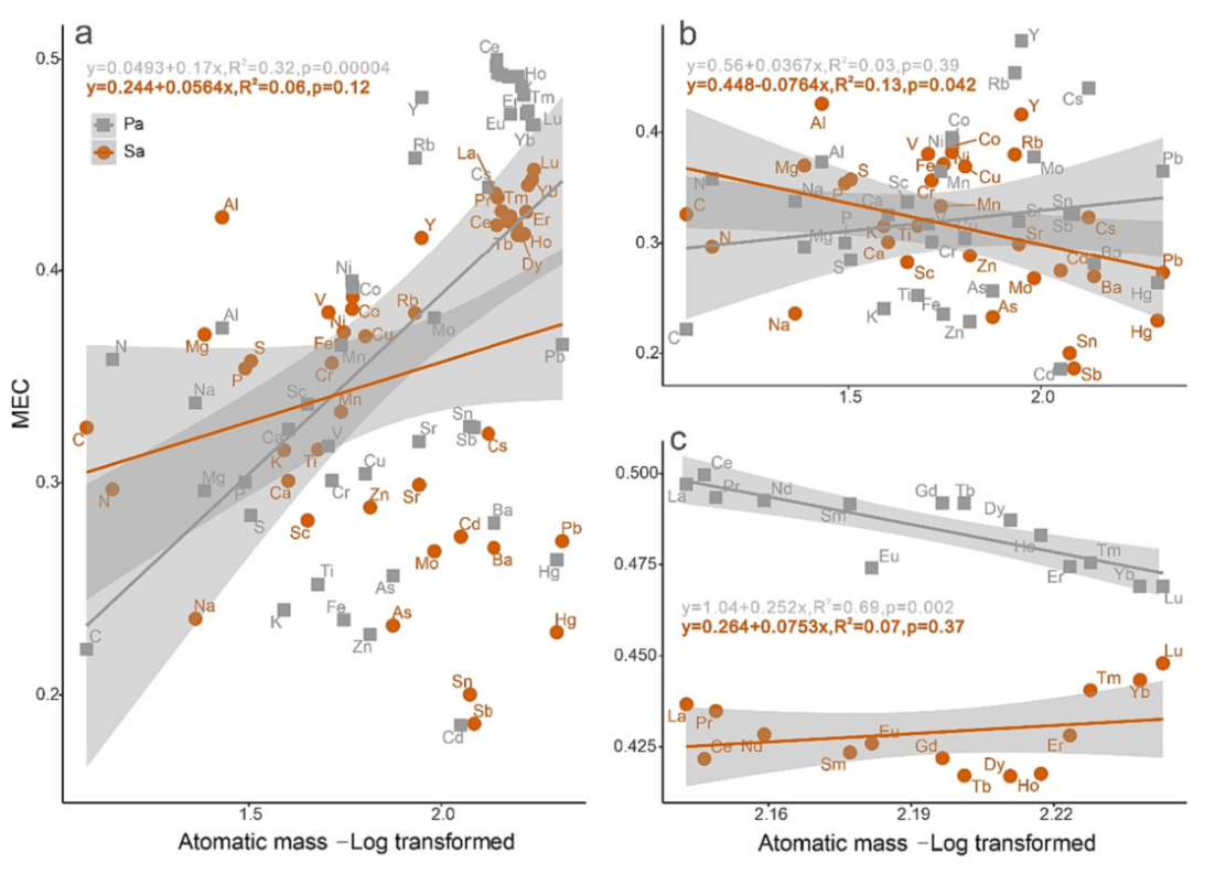 研究結(jié)果表明:互花米草入侵不僅重塑了多元素的地球化學(xué)集散狀態(tài),而且導(dǎo)致濱海濕地土壤多元素解耦。元素原子量是控制多元素耦合的主要因素,隨著原子量增加,土壤中元素耦合程度增強(qiáng)。原子量與多元素耦合程度在蘆葦濕地中顯著相關(guān),但在互花米草入侵后,這種顯著相關(guān)性消失。與較重元素相比,原子量較低元素間的耦合更易受到互花米草入侵的影響,并且耦合程度通常被互花米草入侵所增強(qiáng)。互花米草與蘆葦濕地中稀土元素耦合呈現(xiàn)出截然不同的模式。除了原子量之外,生物過(guò)程、海陸作用分別解釋了多元素耦合的17%的10%變異性,生物過(guò)程與海陸交互作用共同解釋了13%的多元素耦合變異性。本研究表明,在研究濱海互花米草入侵生態(tài)效應(yīng)時(shí),不僅需要關(guān)注其對(duì)碳循環(huán)過(guò)程的影響,也需要考察其導(dǎo)致多元素耦合過(guò)程的改變及其可能的多元素生物地球化學(xué)過(guò)程協(xié)同改變。