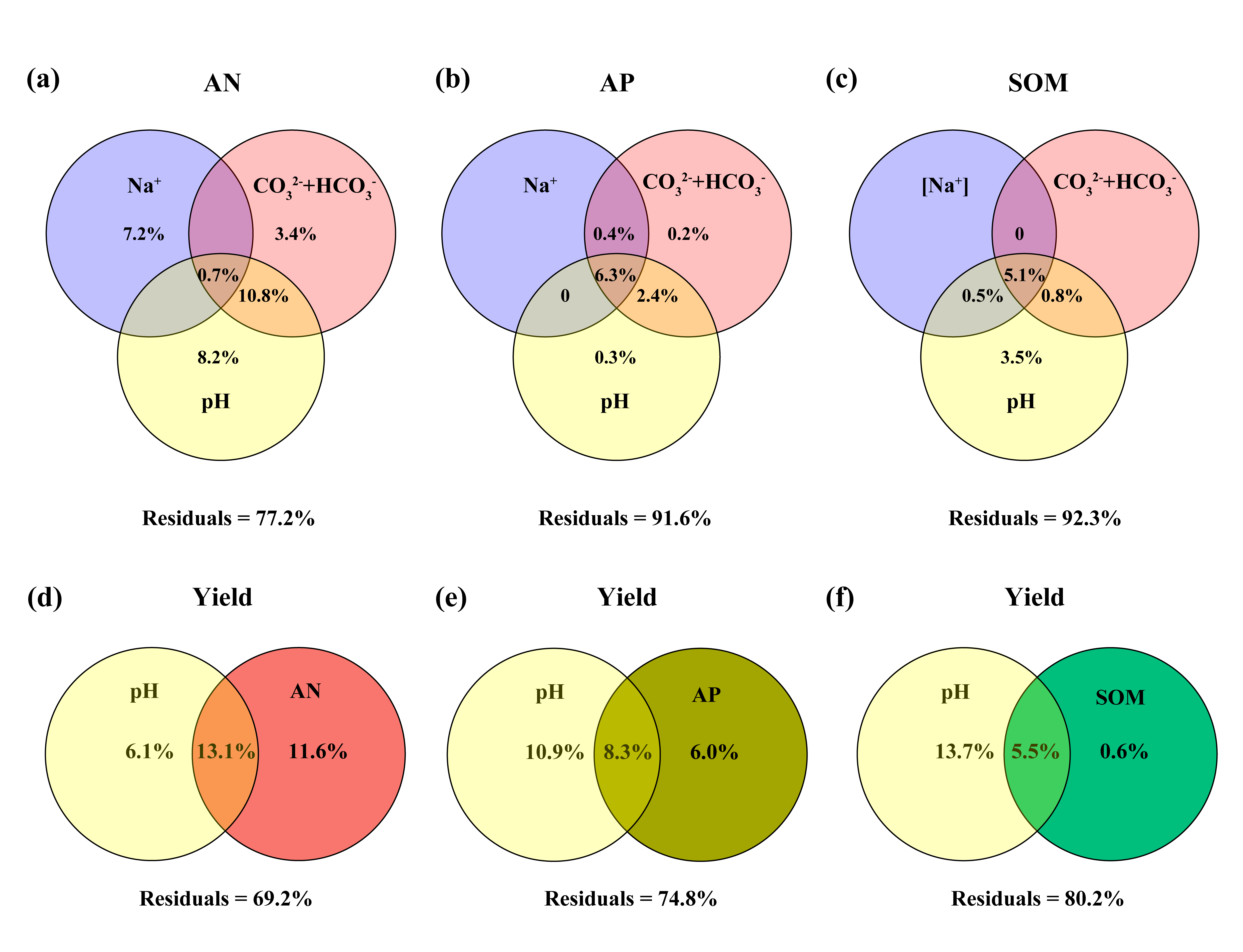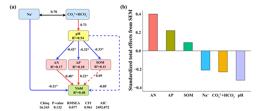 近期,東北地理所科研人員利用吉林大安農(nóng)田生態(tài)系統(tǒng)國家野外科學(xué)觀測研究站內(nèi)隨機(jī)采集的不同鹽堿程度稻田水稻植株和土壤樣品,進(jìn)行科學(xué)分析檢測,通過層次分割和結(jié)構(gòu)方程模型定量評(píng)估了土壤不同化學(xué)指標(biāo)對(duì)水稻產(chǎn)量的獨(dú)立和綜合影響。結(jié)果表明,土壤pH、[CO32?+HCO3?]和堿解氮(AN)是限制蘇打鹽堿地水稻產(chǎn)量最重要的土壤鹽堿參數(shù)、鹽分離子和養(yǎng)分指標(biāo)。在這些因子中,高濃度的CO32?和HCO3?導(dǎo)致了土壤高pH,土壤高pH是限制蘇打鹽堿地水稻產(chǎn)量的關(guān)鍵,而提高土壤AN含量具有抑制pH和碳酸鹽毒害,提升水稻產(chǎn)量的重要作用。尤其在重度鹽堿土(9 ≤ pH < 10)上,提升土壤AN含量,水稻會(huì)表現(xiàn)出更高的增產(chǎn)潛力。因此,降低土壤[CO32?+HCO3?]導(dǎo)致的高pH環(huán)境的同時(shí),提升土壤氮水平是提高鹽堿地水稻產(chǎn)量的關(guān)鍵。