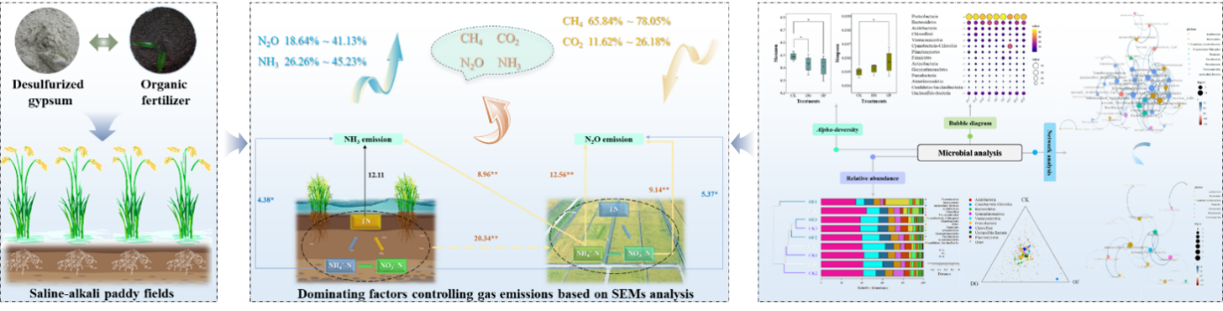 ????東北松嫩平原是世界上蘇打鹽堿地的主要分布區(qū)之一,區(qū)域鹽堿地的大規(guī)模水田開發(fā)是保障國家糧食安全的重要途徑。在“雙碳”目標背景下,稻田生態(tài)系統(tǒng)的溫室氣體排放受到廣泛關(guān)注。東北地理所水環(huán)境污染與防治團隊前期研究發(fā)現(xiàn),重度鹽漬化稻田可能是甲烷(CH4)和氨氣(NH3)的排放熱區(qū)(Wang et al.,2023),因此,在鹽堿地稻田開發(fā)過程中,不同農(nóng)田管理措施產(chǎn)生的碳氮氣體排放問題尤其值得關(guān)注。土壤改良劑已被證實在緩解鹽堿脅迫、改善土壤理化性狀和提高作物產(chǎn)量方面具有顯著效果,但其是否會影響稻田碳氮氣體排放尚無統(tǒng)一結(jié)論。