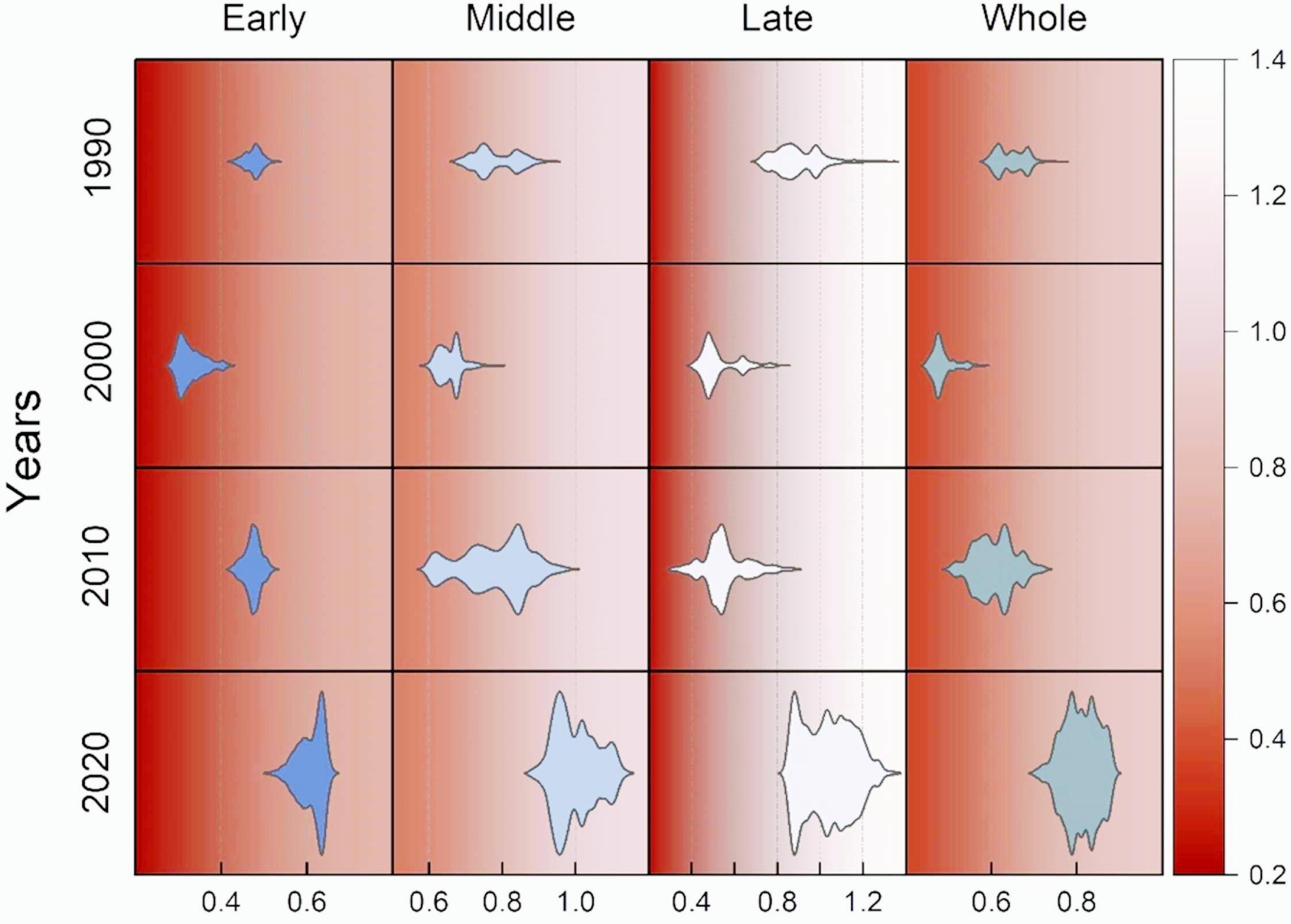 圖1.1990年、2000年、2010年和2020年三江平原水稻不同生育期水分供需匹配度變化