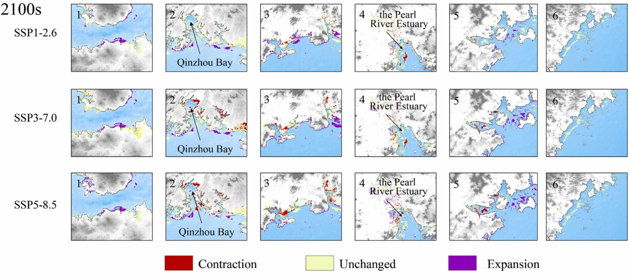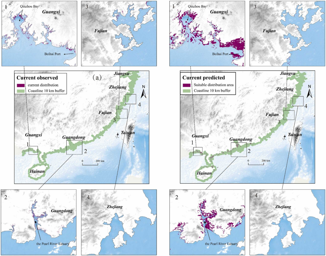 紅樹林濕地是地球上生產(chǎn)力最高的區(qū)域之一,是重要的“碳匯”。然而,由于氣候變化和人類活動的影響,我國紅樹林面積大幅度減少,且被開墾為沿海農(nóng)田和水產(chǎn)養(yǎng)殖池。目前,我國紅樹林面積總體上呈現(xiàn)先減少后增加的特點,且面臨的威脅已由早期的毀林破壞轉(zhuǎn)變?yōu)橐蛉藶楹妥匀灰蛩毓餐饔脤е碌纳鷳B(tài)退化。因此,研究氣候變化對紅樹林潛在分布和碳匯的影響對于其保護和恢復至關重要。本研究基于15種主要紅樹林物種,構建了高精度的物種分布模型,模擬了當前時期(1981-2010年)中國紅樹林的潛在分布,并預測了21世紀末(2071-2100年)三種氣候情景(SSP1-2.6、SSP3-7.0和SSP5-8.5)下的潛在分布。