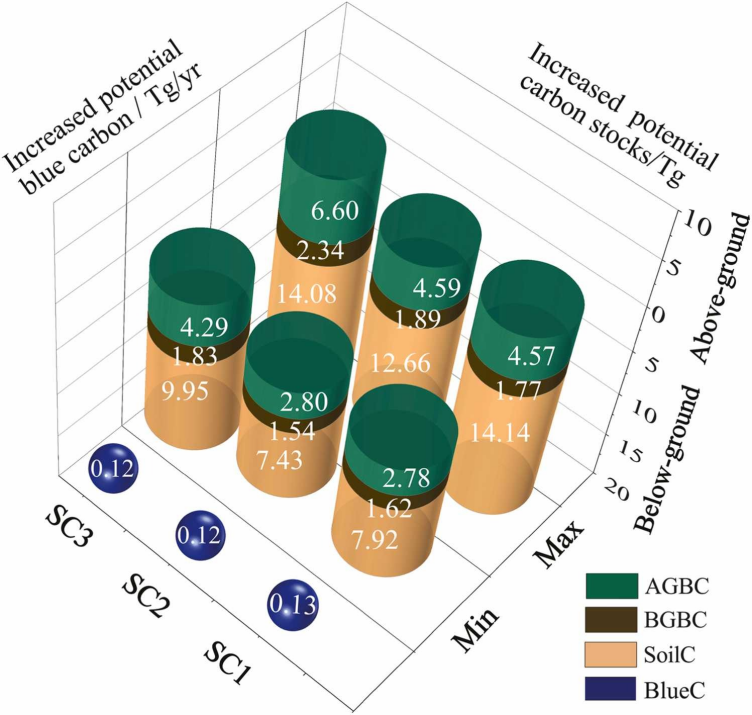 圖3. 三種紅樹林恢復情景下潛在碳庫存和藍碳的增加。(AGBC指地上生物量碳,BGBC指地下生物量碳,SoilC指土壤碳,BlueC指藍碳)。