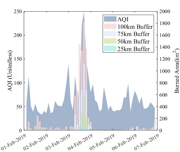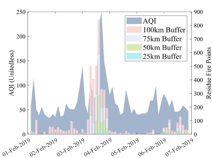 本研究通過提取可見紅外成像輻射儀(VIIRS)火點數(shù)據(jù)、中分辨率成像光譜輻射儀(MODIS)燃燒面積數(shù)據(jù),對比研究了這兩種不同秸稈焚燒參數(shù)與大慶市為中心不同緩沖區(qū)空氣質(zhì)量的相關性。