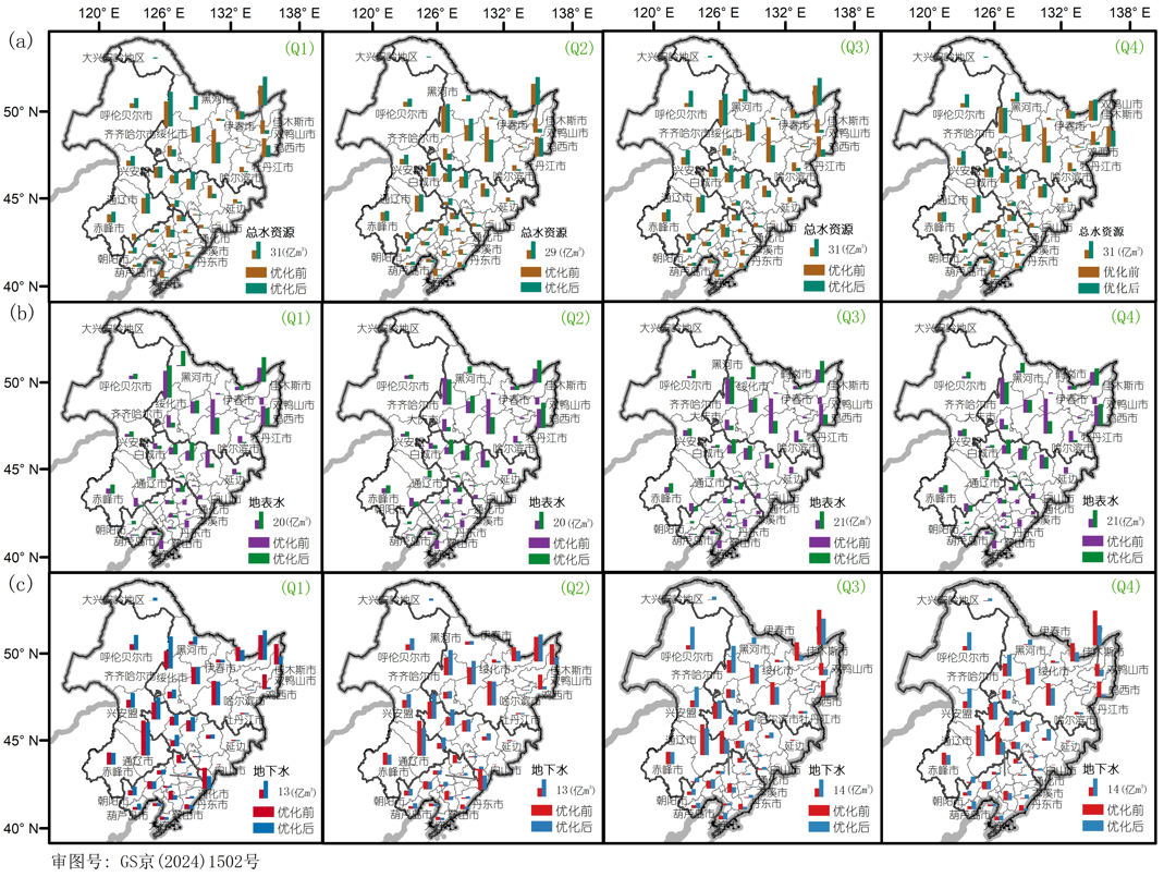 圖2 優(yōu)化前后東北黑土區(qū)水資源開發(fā)利用對比分析(a)總水資源量(b)地表水資源量(c)地下水資源量(Q1:平水年常規(guī)灌溉,Q2:平水年節(jié)水灌溉,Q3:枯水年常規(guī)灌溉,Q4:枯水年節(jié)水灌溉)