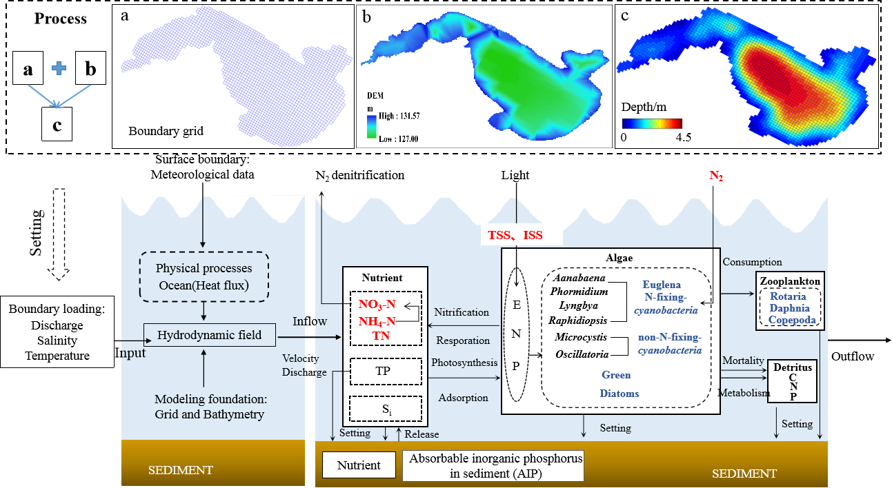圖2?湖泊水動(dòng)力-水質(zhì)-水華綜合模型概念圖