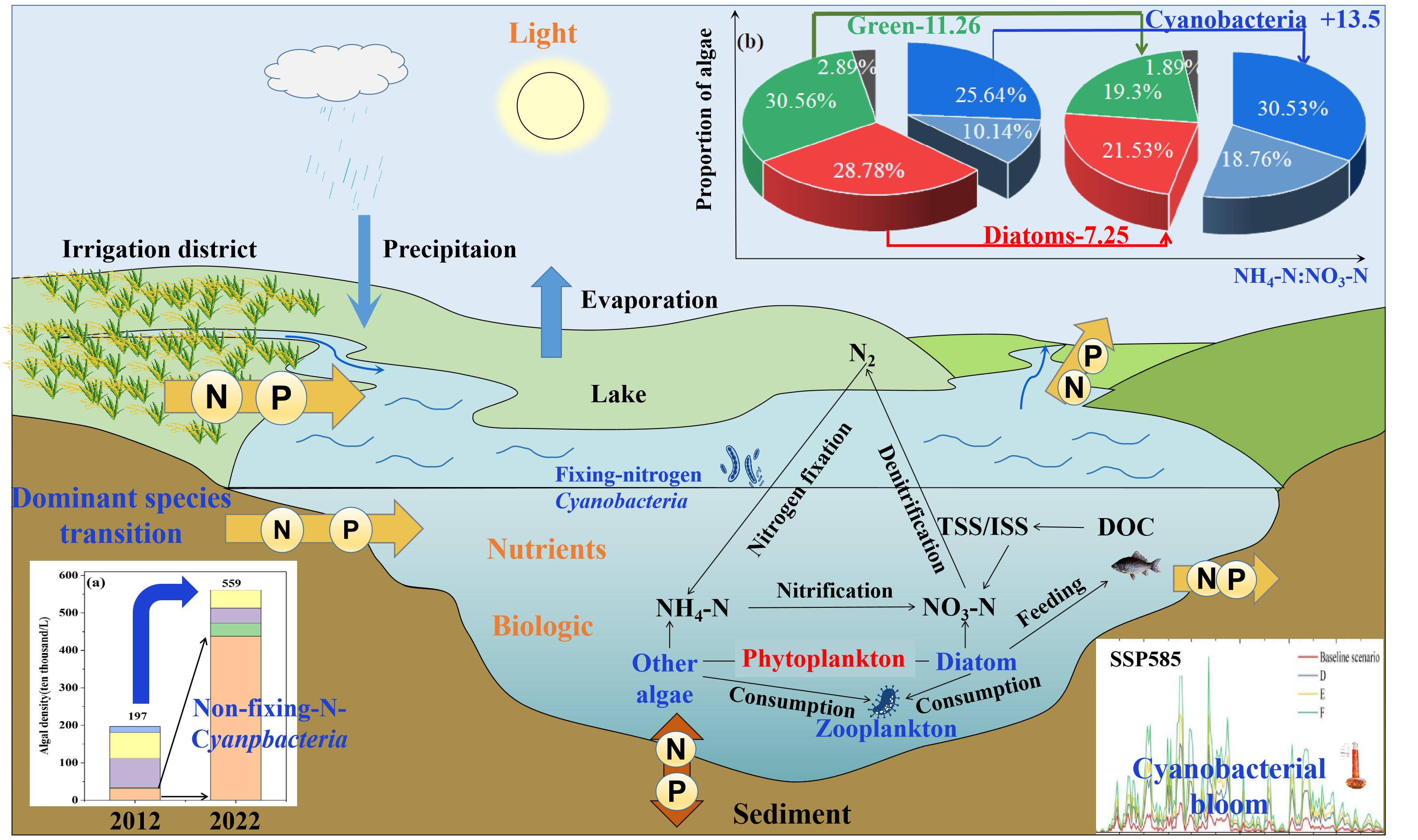 結(jié)果表明:2012-2022年,查干湖浮游植物優(yōu)勢(shì)種從硅藻轉(zhuǎn)變?yōu)樗{(lán)藻(圖1)。基于結(jié)構(gòu)方程模型解析了這一演替的主要環(huán)境變量包括水溫、總氮(TN)、總磷(TP)和氨氮(NH4-N)以及總懸浮顆粒物(TSS)。為了進(jìn)一步探索浮游植物演替的驅(qū)動(dòng)機(jī)制及其對(duì)氣候變化的響應(yīng),我們構(gòu)建了一個(gè)綜合的水動(dòng)力-水質(zhì)-藻華綜合模型來(lái)模擬多環(huán)境因子作用下各類(lèi)型浮游植物生物量的演變(圖2)。發(fā)現(xiàn)了營(yíng)養(yǎng)物質(zhì)的不同比例決定了浮游植物優(yōu)勢(shì)物種的演替。在渾濁水體中,高NH4-N:NO3-N比值有利于藍(lán)藻生長(zhǎng),抑制硅藻生存。此外,硅藻(30.77%vs22.28%)和綠藻(30.56%vs23.30%)的生物量比例急劇下降。相比之下,隨著NH4-N:NO3-N比值的增加,藍(lán)藻豐度顯著增加(35.78%-51.71%)。此外,當(dāng)TN:TP≥20和NH4-N:NO3-N≥10時(shí),非固氮藍(lán)藻生物量占比高于固氮藍(lán)藻。值得注意的是,在SSP585情景下,氣溫上升3.0℃時(shí),藍(lán)藻生物量達(dá)到基線(xiàn)情景的3-6倍。我們強(qiáng)調(diào)了氮形態(tài)對(duì)浮游植物優(yōu)勢(shì)種演替的影響,氣候變暖將增強(qiáng)氮形態(tài)對(duì)優(yōu)勢(shì)種轉(zhuǎn)變的驅(qū)動(dòng)作用(圖3),為控制藍(lán)藻水華提供了科學(xué)依據(jù)。