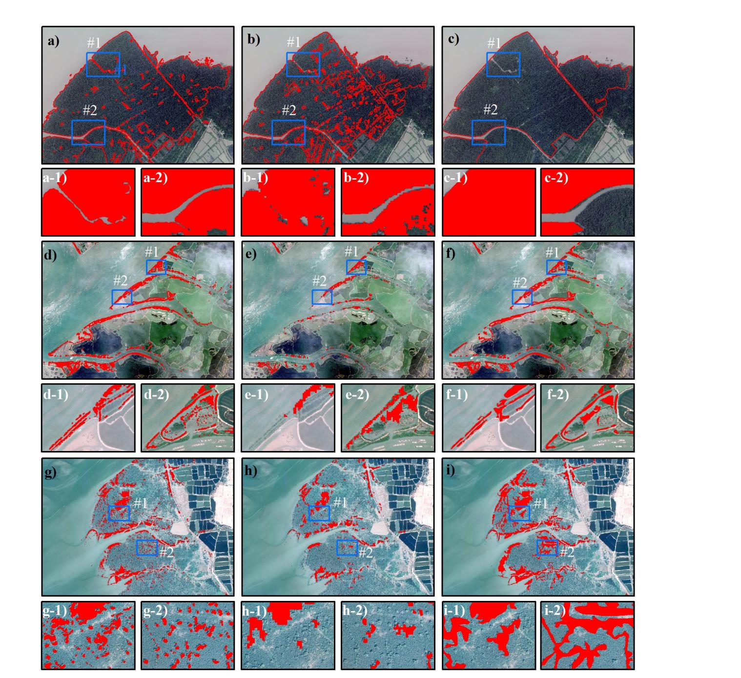 圖1 與現(xiàn)有的無(wú)瓣海桑地圖進(jìn)行比較,重點(diǎn)分析代表性區(qū)域內(nèi)的差異。第一列為本研究繪制的個(gè)體水平無(wú)瓣海桑地圖,第二列是使用Sentinel-2圖像和隨機(jī)森林算法獲取的分布結(jié)果,第三列是基于野外調(diào)查和谷歌地球影像進(jìn)行視覺解釋得到的分布結(jié)果。