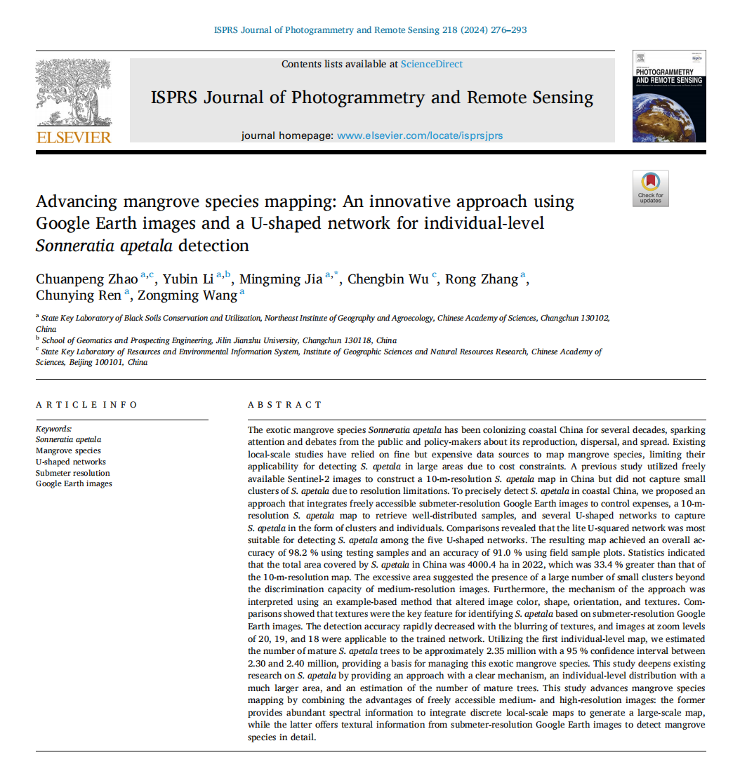 無(wú)瓣海桑(Sonneratia apetala)是紅樹林優(yōu)良喬木樹種,為了恢復(fù)因沿海開發(fā)而受損的紅樹林,該紅樹林樹種已在中國(guó)被廣泛引種以用于造林和再造林。然而,無(wú)瓣海桑具有一定的競(jìng)爭(zhēng)和擴(kuò)散能力,其潛在的入侵能力引起了我國(guó)學(xué)者的廣泛擔(dān)憂和關(guān)注。中國(guó)科學(xué)院東北地理所地理景觀遙感學(xué)科組的趙傳朋和賈明明副研究員為解決遙感影像成本限制對(duì)精細(xì)化紅樹林物種制圖的影響,提出了將亞米分辨率谷歌地球影像和深度學(xué)習(xí)相結(jié)合的無(wú)瓣海桑提取新方法,發(fā)表論文“Advancing mangrove species mapping: An innovative approach using Google Earth images and a U-shaped network for individual-level Sonneratia apetala detection”。應(yīng)用上述方法,以公開且免費(fèi)獲取的谷歌地球影像為數(shù)據(jù)源,建立亞米分辨率的2022年中國(guó)無(wú)瓣海桑空間分布數(shù)據(jù)集。