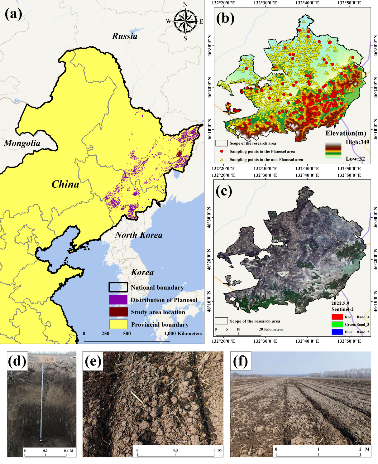 圖1. 研究區(qū)位圖:(a)研究區(qū)位置及東北地區(qū)白漿土分布;(b)采樣點(diǎn)分布圖;(c)5月份Sentinel-2遙感影像;(d)白漿土剖面照片;(e)白漿土耕地表面照片;(f)景觀照
