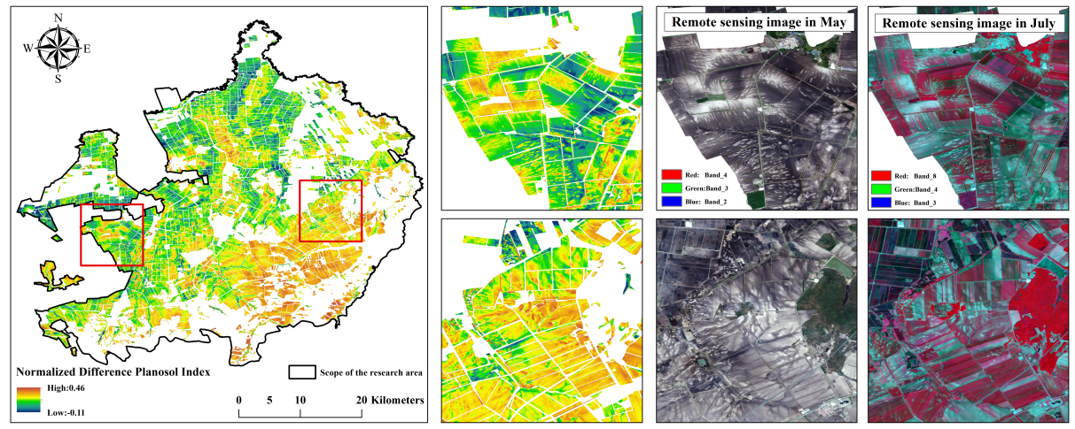 針對(duì)這一問(wèn)題,中國(guó)科學(xué)院東北地理與農(nóng)業(yè)生態(tài)研究所農(nóng)業(yè)遙感學(xué)科組的研究人員在典型白漿土與非白漿土交錯(cuò)區(qū)——八五二農(nóng)場(chǎng),開(kāi)展了相關(guān)研究。研究團(tuán)隊(duì)首先篩選出2021至2023年研究區(qū)所有裸土期(4-5月)無(wú)云的Sentinel-2影像,基于白漿土與非白漿土的光譜差異,創(chuàng)新性地構(gòu)建了“Normalized Difference Planosol Index (NDPI)”遙感指數(shù),用以反映白漿層的上翻程度,提取土壤“白度”信息。結(jié)合混合概率模型,研究人員評(píng)估了該指數(shù)在白漿土分布提取及SOM制圖中的應(yīng)用效果。