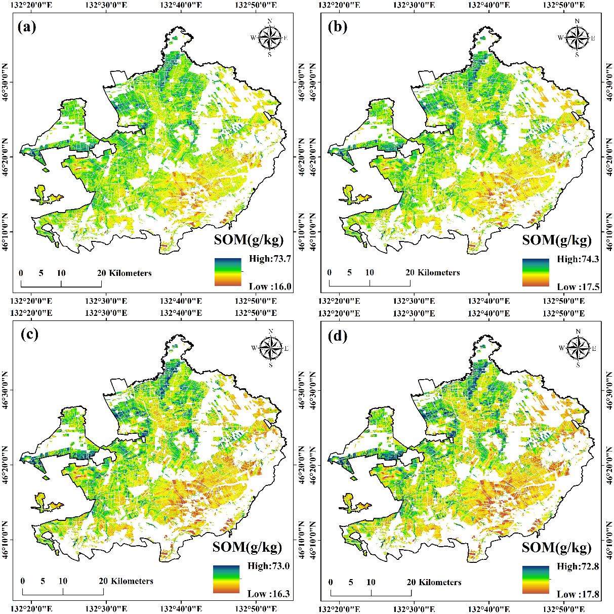 研究發(fā)現(xiàn),5月是典型白漿土與非白漿土交錯(cuò)區(qū)開(kāi)展SOM制圖與白漿土提取的最佳時(shí)間窗口。基于隨機(jī)森林模型,結(jié)合多期5月份的裸土影像,研究團(tuán)隊(duì)成功實(shí)現(xiàn)白漿土空間分布的高精度提取,總體精度高達(dá)97.66%,Kappa系數(shù)為0.93。同時(shí),研究表明混合概率模型在SOM制圖中優(yōu)于傳統(tǒng)全局模型,表現(xiàn)最佳的模型R2達(dá)到0.81,RMSE為4.29 g/kg,且制圖結(jié)果更加平滑和連續(xù)。此外,NDPI指數(shù)的引入,不僅有效提升了白漿土分布的提取精度,也顯著提高了該區(qū)域SOM制圖的準(zhǔn)確性。