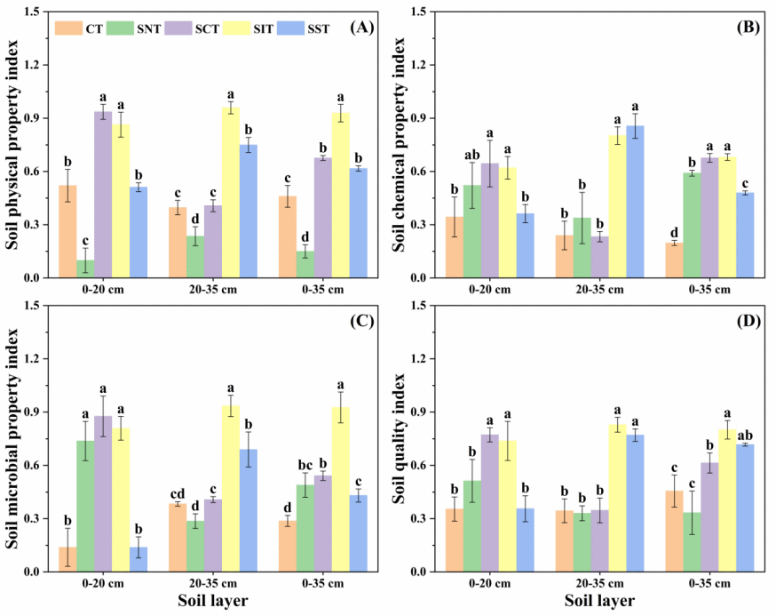 圖1. 秸稈還田對土壤質(zhì)量、土壤物理、化學(xué)和微生物性質(zhì)指數(shù)的影響。CT,常規(guī)耕作;SNT,免耕與秸稈還田相結(jié)合;SCT,常規(guī)耕作與秸稈還田相結(jié)合;SIT,深翻與秸稈還田相結(jié)合;SST,秸稈填埋還田。