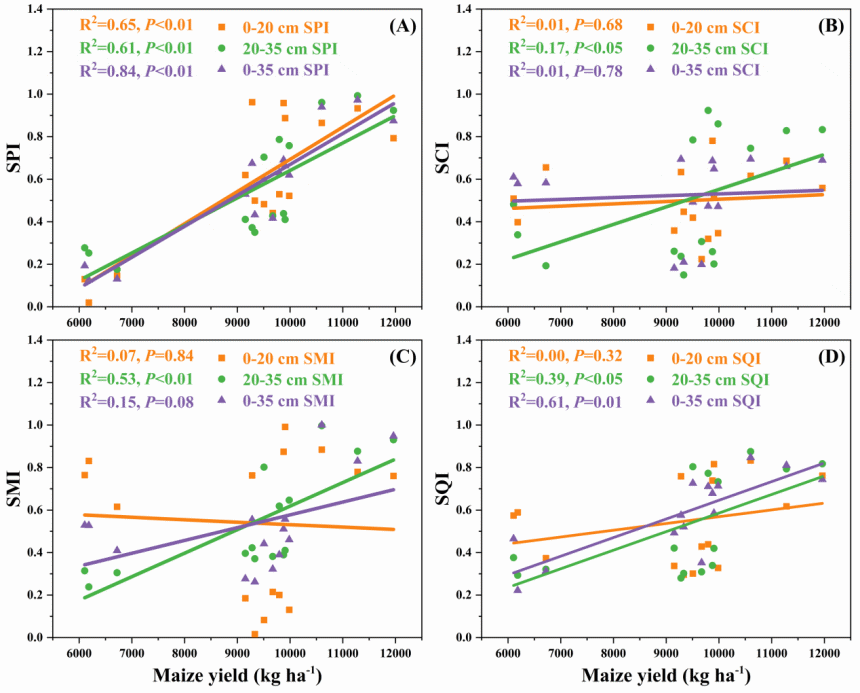 圖2. 玉米產(chǎn)量與土壤性質(zhì)指標(biāo)的相關(guān)性擬合。SQI,土壤質(zhì)量指數(shù);SPI,土壤物理性質(zhì)指數(shù);SCI,土壤化學(xué)性質(zhì)指數(shù);SMI,土壤微生物特性指數(shù)。