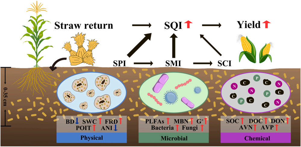 東北地理所黑土保護(hù)與利用學(xué)科組研究人員依托位于黑土區(qū)的秸稈還田長期定位試驗(yàn),探究了秸稈還田深度對土壤質(zhì)量和玉米產(chǎn)量的影響,通過分析土壤物理性質(zhì)指數(shù)(SPI)、化學(xué)性質(zhì)指數(shù)(SCI)和微生物性質(zhì)指數(shù)(SMI)與土壤質(zhì)量指數(shù)(SQI)和作物產(chǎn)量的關(guān)系,解析了適宜的秸稈還田方式在改善土壤質(zhì)量、提升玉米產(chǎn)量方面的驅(qū)動機(jī)制,研究結(jié)果對提高土壤質(zhì)量和制定可持續(xù)農(nóng)業(yè)發(fā)展策略具有重要指導(dǎo)意義。