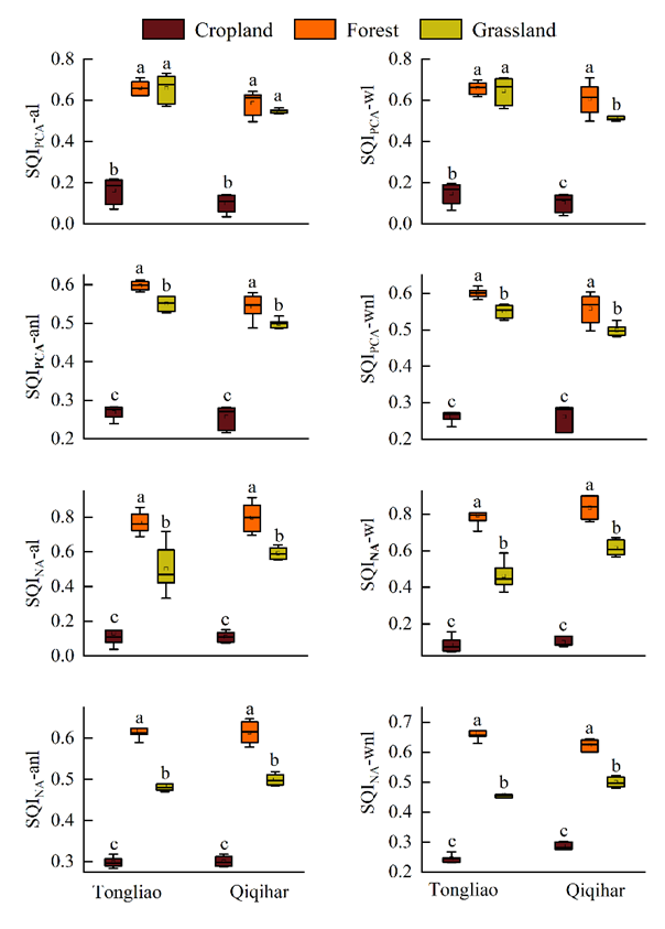 本研究通過NA和PCA法量化土壤質(zhì)量指數(shù)(Soil Quality Index,SQI),以探究土地利用類型(農(nóng)田、林地和草地)對(duì)中國東北風(fēng)蝕區(qū)(通遼的科爾沁沙地和齊齊哈爾的松嫩沙地)的SQI的影響。為了選擇最小數(shù)據(jù)集(MDS),共測量了27個(gè)土壤物理、化學(xué)和生物性質(zhì),并使用加法、加權(quán)方法以及線性、非線性評(píng)分函數(shù)在兩個(gè)研究地點(diǎn)各確定了8組SQI值。