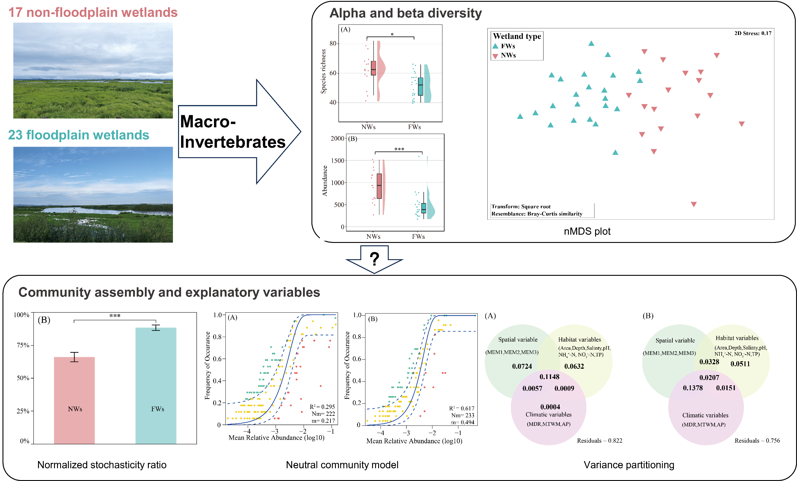研究表明,三江平原淡水沼澤濕地中,水文情勢波動較小的非洪泛濕地的大型水生無脊椎動物豐富度、密度及生境特化種數(shù)量高于水文波動較大的洪泛濕地,非洪泛濕地的群落組成主要受到空間變量影響,而洪泛濕地則主要受棲息地環(huán)境變量影響;隨機過程驅(qū)動了大型水生無脊椎動物群落構(gòu)建,洪泛濕地隨機過程較非洪泛濕地更顯著(圖1)。
