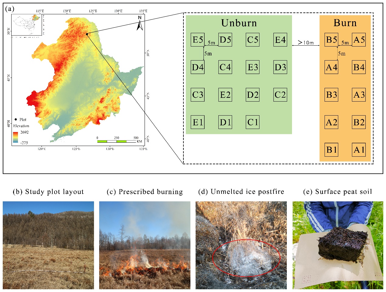 氣候變化和人類活動正在增加泥炭地野火的頻率,嚴重威脅多年凍土區(qū)泥炭地的碳庫。大興安嶺凍土泥炭地是我國唯一的高緯度多年凍土泥炭地,位于全球高緯度多年凍土區(qū)的最南端,對氣候變化具有高度敏感性。該地區(qū)泥炭地與森林生態(tài)系統(tǒng)交錯分布,在林火頻發(fā)的大興安嶺地區(qū)具有重要生態(tài)功能。作為林緣部位的重要生態(tài)系統(tǒng),大興安嶺泥炭地在區(qū)域林火防控中發(fā)揮著關(guān)鍵作用。目前,大興安嶺多年凍土區(qū)林緣泥炭地火管理已成為森林防火的重要手段,并由當?shù)亓謽I(yè)部門每年秋季對區(qū)內(nèi)林緣泥炭地實施計劃火燒。雖然計劃火燒對防控森林火災效果顯著,然而計劃火燒也通過消耗地表枯落物和產(chǎn)生熱解碳對泥炭地的碳庫產(chǎn)生影響,其影響過程和潛在機制亟待評估。