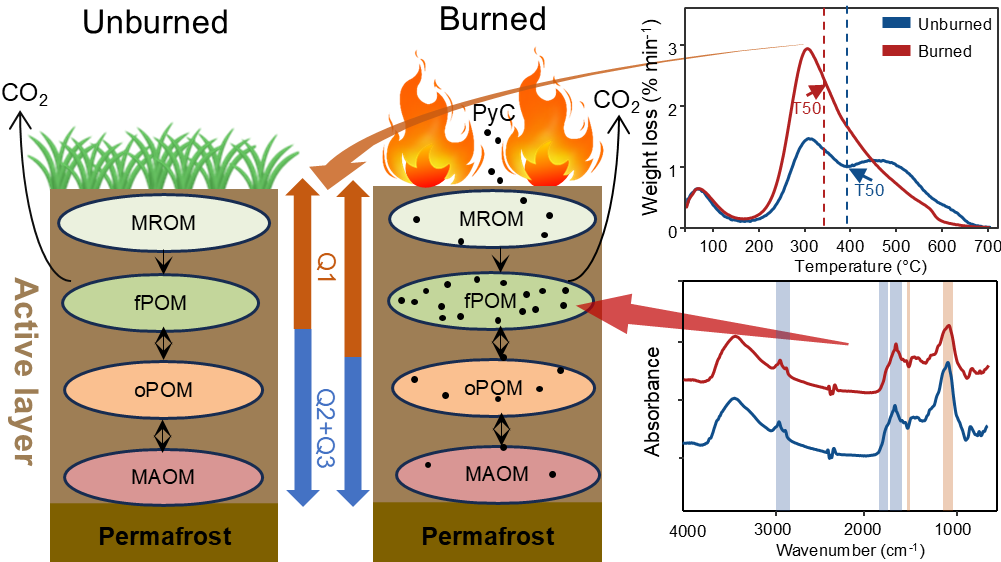 與此同時,連續(xù)低強度的計劃火燒降低了多年凍土區(qū)泥炭地的土壤碳穩(wěn)定性,火后熱解碳的輸入成為泥炭土壤輕組碳組分的一部分,并主要保留在fPOM組分中(圖 3)。進一步化學分析表明,計劃火燒導致fPOM碳成分變化,火燒區(qū)的fPOM中芳香度增加了32%,這意味著泥炭土壤fPOM組分的穩(wěn)定性明顯增加。然而,連續(xù)火燒后泥炭土壤熱穩(wěn)定性下降,表現(xiàn)為Q1比例增加以及T50降低,計劃火燒通過改變fPOM碳組成,影響了土壤熱穩(wěn)定性。而盡管增加了fPOM中芳香族化合物含量,但同時也促使土壤酶活性和二氧化碳的排放量的增加,對土壤碳穩(wěn)定性產(chǎn)生了十分復雜的影響。