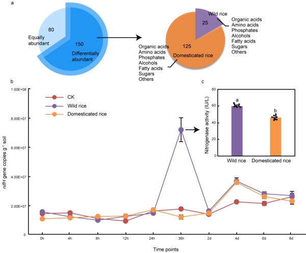 栽培稻的根際微生物組中與氧化亞氮(N?O)生成相關(guān)基因數(shù)量顯著增加。通過田間測量N?O排放量發(fā)現(xiàn),栽培稻土壤中的N?O排放量顯著高于野生稻。為解析水稻馴化對(duì)根際氮循環(huán)微生物組的調(diào)控機(jī)制,研究人員系統(tǒng)比較野生稻和栽培稻根系代謝組,發(fā)現(xiàn)野生稻根系分泌物與微生物固氮基因豐度呈正相關(guān)。進(jìn)一步實(shí)驗(yàn)表明,向黑土中添加野生稻根系代謝物,可以顯著增加土壤微生物固氮基因豐度和固氮酶活性。