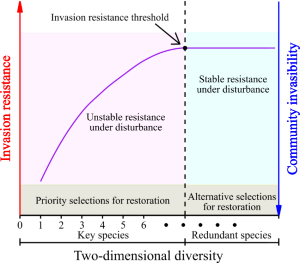 圖2 兩維度多樣性對本地群落入侵抵抗力的可能作用。當(dāng)本地群落達(dá)到入侵抵抗力閾值后,繼續(xù)增加兩維度多樣性不會增加入侵抵抗力。在達(dá)到這個閾值前,系統(tǒng)的入侵抵抗力在干擾下不穩(wěn)定,并且重要物種的喪失會降低入侵抵抗力