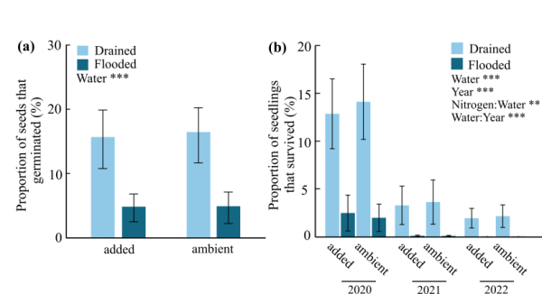 本研究在我國(guó)北方草本濕地生態(tài)系統(tǒng)進(jìn)行連續(xù)三年的野外控制實(shí)驗(yàn),探討干旱化和養(yǎng)分富集對(duì)灌木在草本沼澤中建殖的影響(圖 1)。通過設(shè)置不同水位(淹水vs.干旱)和養(yǎng)分(對(duì)照vs.氮添加)的全因子交互處理,并在每種處理水平下播種多種灌木種子,記錄灌木種子萌發(fā),幼苗存活,幼苗生長(zhǎng)以及周圍草本植被群落的生長(zhǎng)情況,進(jìn)而研究干旱化和氮富集對(duì)灌木在草本植物群落中擴(kuò)張的直接和間接影響。