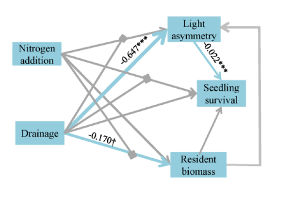 結(jié)果發(fā)現(xiàn)第一年干旱化會(huì)顯著增加灌木植物的種子萌發(fā)和幼苗存活,且對(duì)幼苗存活的促進(jìn)作用一直持續(xù)到后兩年(圖 2)。結(jié)構(gòu)方程模型顯示干旱化通過間接降低灌木和草本植物對(duì)地上光資源的不對(duì)稱性競(jìng)爭(zhēng)進(jìn)而促進(jìn)了灌木幼苗的存活(圖 3)。此外,三年持續(xù)的淹水處理導(dǎo)致了灌木幼苗全部死亡,但是經(jīng)過三年的干旱處理后,氮添加顯著地增加了灌木植株的葉片數(shù)、株高和莖粗(圖 4)。