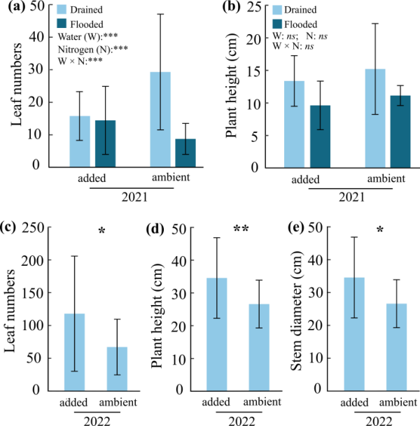本研究表明了干旱化為灌木在淡水沼澤中的建殖提供了重要的基礎(chǔ)條件。當(dāng)幼苗成熟后,氮富集可以通過促進(jìn)灌木的生長(zhǎng)進(jìn)而促進(jìn)其擴(kuò)張。我們的研究通過探討干旱化和氮富集對(duì)本木植物不同建殖階段的影響,為探究全球變化背景下草本濕地中的灌木擴(kuò)張機(jī)制提供了新視角。