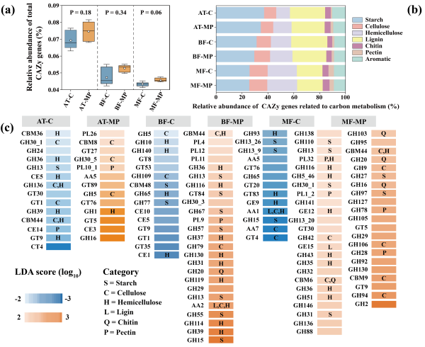 結(jié)果表明,PE微塑料對長白山不同海拔帶土壤養(yǎng)分的影響存在顯著差異,但均導(dǎo)致土壤pH值升高。在低海拔地區(qū)(MF),微塑料顯著提升了土壤溶解有機質(zhì)(DOM)的腐殖化程度和細菌群落的α多樣性,而對中、高海拔(BF和AT)區(qū)域的類似效應(yīng)較弱。此外,微塑料促進了中、低海拔(BF和MF)區(qū)域土壤中碳水化合物活性酶(CAZy)功能基因的富集,表明其對微塑料對不同海拔土壤碳代謝途徑存在差異化調(diào)控。