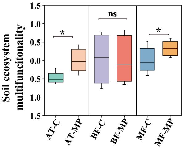微塑料污染已延伸至偏遠山地生態(tài)系統(tǒng),但其對土壤生態(tài)系統(tǒng)功能潛在影響的研究仍較為有限。鑒于此,中國科學(xué)院東北地理與農(nóng)業(yè)生態(tài)研究所濕地生物與環(huán)境研究團隊在長白山針闊混交林(MF)、岳樺林(BF)和苔原帶(AT)三個典型海拔帶開展原位實驗,系統(tǒng)揭示了聚乙烯(PE)微塑料對土壤養(yǎng)分循環(huán)、微生物多樣性及碳代謝功能基因的影響,并定量解析了其對土壤生態(tài)系統(tǒng)多功能性的驅(qū)動機制。