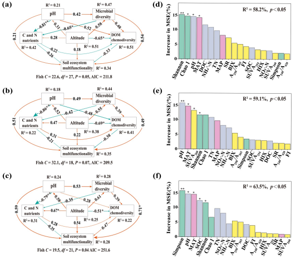 研究發(fā)現(xiàn),微塑料對不同海拔帶土壤生態(tài)系統(tǒng)多功能性具有差異性影響。進一步分析表明,土壤細菌多樣性、pH值、有機碳、DOM化學(xué)多樣性及年平均溫度等因子共同構(gòu)成土壤生態(tài)系統(tǒng)多功能性的核心驅(qū)動網(wǎng)絡(luò)。