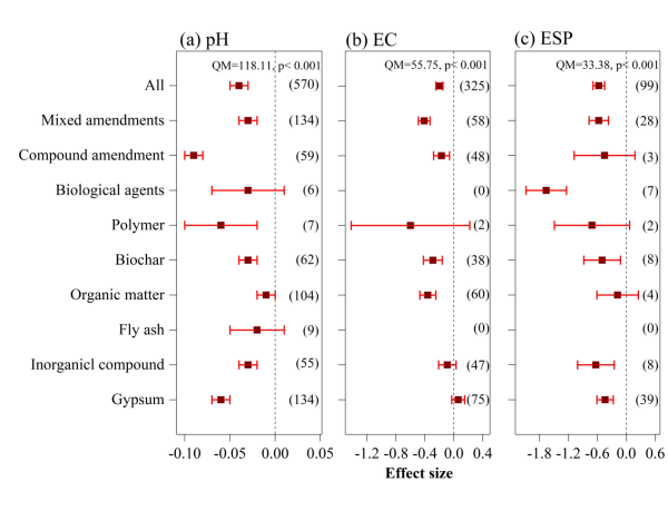 研究采用Meta分析方法,綜合了全國范圍內(nèi)1992-2022年30年間公開發(fā)表的有關(guān)不同改良劑在鹽堿地改良效果上的相關(guān)報(bào)道,采納了有關(guān)田間試驗(yàn)報(bào)道的92篇相關(guān)文獻(xiàn)中的2061組研究數(shù)據(jù),綜合分析了當(dāng)前國內(nèi)鹽堿土改良劑的研究現(xiàn)狀,量化評估了不同類型改良劑對鹽堿土的改良效果,利用機(jī)器學(xué)習(xí)模型解析了影響改良劑應(yīng)用效果的相關(guān)因素。