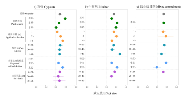 研究發(fā)現(xiàn),不同類型改良劑的改良效果存在顯著差異(p < 0.05),石膏類改良劑、生物炭和混合改良劑施用后土壤堿度分別降低21.5%、19.6%和37.0%;生物炭對土壤養(yǎng)分含量提升效果最佳(47.8%),石膏類改良劑相對最低(26.4%)。三種改良劑多用于中、重度蘇打鹽堿土表層(0~20 cm)土壤改良,其施用量和施用年限對土壤改良效果存在差異。改良劑施用量是影響石膏類改良劑、生物炭和混合改良劑等降低土壤堿化度和鹽分效果的主要因素。石膏類改良劑主要作用原理是降低土壤堿度,進(jìn)而間接提升土壤養(yǎng)分和促進(jìn)作物生長,生物炭和混合改良劑兼具降低土壤堿度和直接提供土壤養(yǎng)分的作用。土壤改良劑在選擇使用上不僅要考慮用量,種植作物類型、改良劑成本、作用效果持久性以及環(huán)境安全性問題也是重要的參考因素。這些研究結(jié)果為蘇打鹽堿地改良劑的科學(xué)選擇提供了理論依據(jù)。