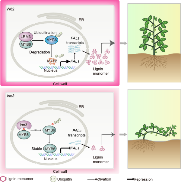 中國(guó)科學(xué)院東北地理與農(nóng)業(yè)生態(tài)研究所馮獻(xiàn)忠研究團(tuán)隊(duì)通過大規(guī)模篩選大豆突變體庫(kù),分離到倒伏突變體lodging-related mutant 3(lrm3),與野生型相比,lrm3突變體的莖稈中木質(zhì)素含量下降80%,莖稈強(qiáng)度下降60%。通過圖位克隆技術(shù),克隆了控制倒伏表型的目的基因LRM3,該基因編碼一個(gè)U-box型E3泛素連接酶。進(jìn)一步實(shí)驗(yàn)證明,LRM3可以通過26S蛋白酶體途徑促進(jìn)MYB6蛋白的降解來提高大豆的抗倒伏性;MYB6蛋白直接結(jié)合在木質(zhì)素合成限速酶—苯丙氨酸解氨酶PAL1/2的啟動(dòng)子上抑制其表達(dá),從而降低木質(zhì)素的合成,降低大豆抗倒伏性。這項(xiàng)研究發(fā)現(xiàn)了調(diào)控大豆莖稈強(qiáng)度的LRM3-MYB6-PALs的分子模塊,為大豆抗倒伏性狀的分子育種提供了重要的分子靶標(biāo)。
