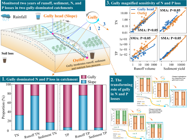 近日,東北地理所黑土退化與修復(fù)學(xué)科組郭明明研究團(tuán)隊(duì)在降雨下溝道調(diào)控東北黑土區(qū)農(nóng)業(yè)集水區(qū)徑流、泥沙、氮和磷的流失模式取得進(jìn)展。該項(xiàng)研究以東北黑土區(qū)2條侵蝕溝所在集水區(qū)為研究對(duì)象,對(duì)2022、2023年所有次降雨過(guò)程中入溝和出流域的徑流、泥沙、氮和磷流失過(guò)程進(jìn)行了原位監(jiān)測(cè)。結(jié)果表明:集水區(qū)63.9%的徑流源自坡面,而溝道貢獻(xiàn)了集水區(qū)95.1%的土壤流失量;在總氮和總磷流失中,溝道的作用也顯著大于坡面,分別貢獻(xiàn)了集水區(qū)總氮和總磷流失總量的71.6%和94.8%。徑流與泥沙來(lái)源的空間異質(zhì)性顯著改變了氮磷流失形態(tài),從坡面到溝道,總氮流失的主導(dǎo)形態(tài)從徑流總氮轉(zhuǎn)變?yōu)槟嗌晨偟瑫r(shí)進(jìn)一步提高了集水區(qū)內(nèi)泥沙總磷流失的占比(>90%)。總氮和總磷流失對(duì)土壤流失過(guò)程的敏感性均顯著高于徑流過(guò)程(圖1)。這表明,在以溝道為主導(dǎo)的集水區(qū)中,控制土壤流失比減少?gòu)搅鞲苡行Ь徑廪r(nóng)田氮、磷的流失,因此調(diào)流控蝕應(yīng)作為農(nóng)業(yè)集水區(qū)氮磷管理的優(yōu)先策略。研究結(jié)果可為溝道主導(dǎo)型農(nóng)業(yè)集水區(qū)的侵蝕防治和面源污染治理提供科學(xué)依據(jù)。