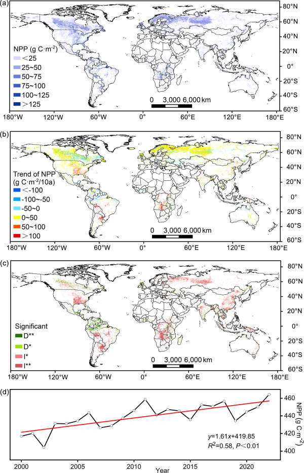 圖1 全球沼澤濕地植被凈初級(jí)生產(chǎn)力格局及時(shí)空變化