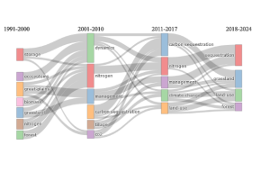 近日,中國科學院東北地理所鹽堿地資源與利用學科組在生態(tài)學期刊《Ecological Processes》上發(fā)表了題為上發(fā)表了題為“Towards smart soil carbon pool management of grassland: a bibliometric overview from past to future”的研究論文。該研究運用文獻計量學方法,系統(tǒng)梳理了從1991年到2024年在Web of Science數(shù)據(jù)庫中發(fā)表的2151篇相關(guān)論文,全面總結(jié)了草地土壤碳庫在不同土地利用模式下的變化特征和研究熱點,深入挖掘了影響草地碳庫的多維度耦合機制及其演變規(guī)律。研究表明,草地土壤碳庫的研究焦點已經(jīng)從宏觀層面的生物量-碳庫關(guān)系,逐步轉(zhuǎn)向微觀層面的微生物機制及碳氮循環(huán)耦合效應(yīng),呈現(xiàn)出從區(qū)域尺度到全球氣候變化背景下的多尺度研究趨勢。關(guān)鍵詞共現(xiàn)網(wǎng)絡(luò)分析揭示了三個核心研究主題:碳氮耦合調(diào)控機制、微生物介導的管理措施與碳固存路徑,以及氣候-植被-土壤有機碳的級聯(lián)效應(yīng)。論文還系統(tǒng)總結(jié)了草地土壤碳庫在不同土地利用方式下的研究進展,提出了“草地土壤碳庫智慧管理”新框架,為應(yīng)對氣候變化、實現(xiàn)碳中和目標提供了重要的理論支持和技術(shù)指導。