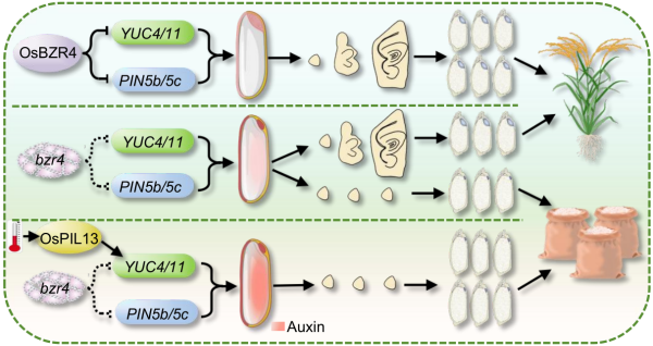 該研究首次發(fā)現(xiàn),OsBZR4是調(diào)控?zé)o胚水稻的關(guān)鍵基因,在不同栽培品種中突變?cè)摶蚓僧a(chǎn)生60%-100%的無(wú)胚種子。OsBZR4特異表達(dá)于盾片-胚乳界面。進(jìn)一步發(fā)現(xiàn)OsBZR4抑制YUC4和PIN5b的表達(dá),通過(guò)調(diào)控早期發(fā)育種子中生長(zhǎng)素含量和分布來(lái)發(fā)揮作用。外源施加生長(zhǎng)素或過(guò)量表達(dá)YUC4均能提高水稻無(wú)胚率,而施用生長(zhǎng)素運(yùn)輸抑制劑NPA則降低無(wú)胚率。此外,高溫環(huán)境會(huì)顯著增加bzr4突變株系的無(wú)胚率,發(fā)現(xiàn)高溫能誘導(dǎo)OsPIL13基因表達(dá),OsPIL13促進(jìn)YUC4的轉(zhuǎn)錄,進(jìn)一步增加生長(zhǎng)素含量,從而解析高溫增加無(wú)胚率的機(jī)制。有意義的是,將bzr4等位突變導(dǎo)入優(yōu)良水稻品種中嘉10和中嘉11,在不影響水稻產(chǎn)量前提下,可提高精米產(chǎn)量和耐儲(chǔ)性。