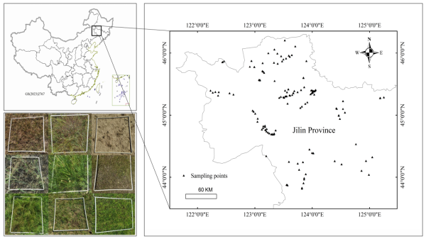 圖1 吉林省西部采樣點位置及典型樣方調(diào)查照片