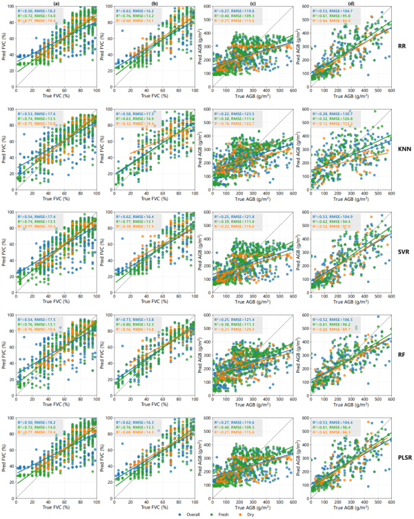 建模過程中,研究采用了五種主流回歸算法(嶺回歸、k近鄰、支持向量回歸、隨機森林和偏最小二乘回歸),并分別在兩組輸入變量上開展訓練。結(jié)果表明,對鮮草和干草分別建模,平均可提升模型決定系數(shù)(R2)0.23,最大降低均方根誤差(RMSE)達41%。其中,融入植被高度信息對提升AGB估算精度尤為關鍵,最優(yōu)模型R2可達0.62(圖3)。該研究所提出的技術(shù)框架僅依賴輕量化RGB影像和低成本計算資源,具備實地實時應用的巨大潛力,為多尺度草地遙感監(jiān)測與生態(tài)評估提供了新的可靠工具。